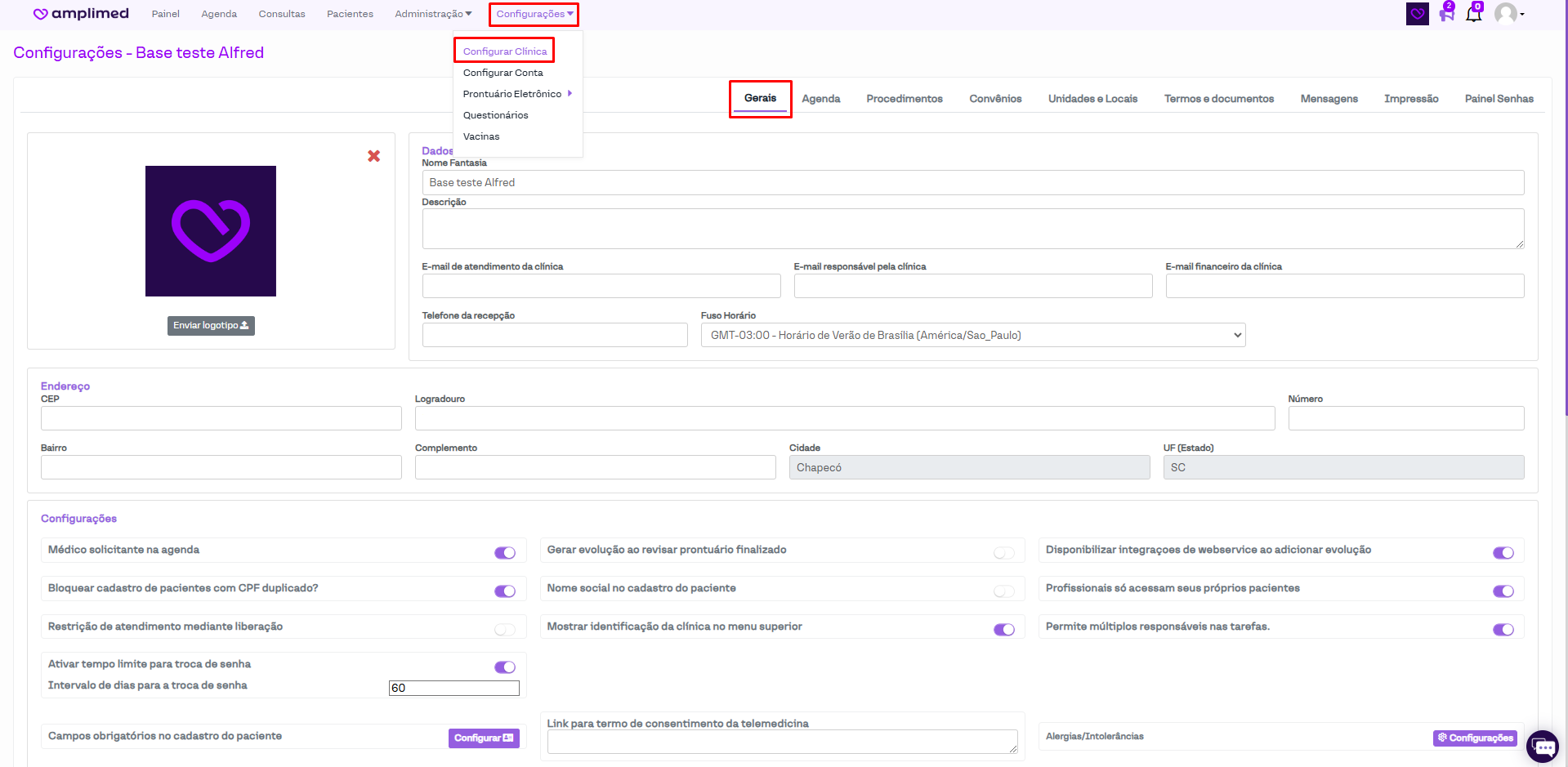 Acesse: Configurações > Configurar Clínica > Gerais.