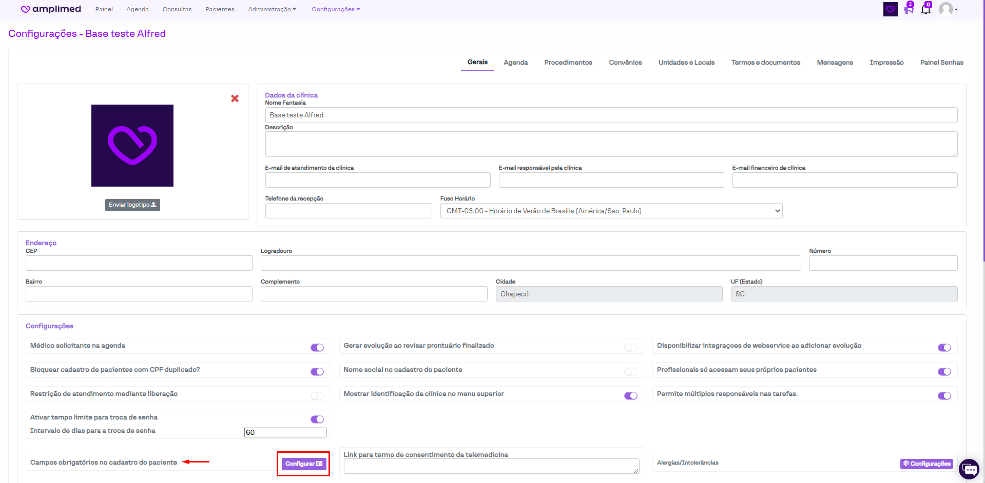 Os demais campos podem ser ajustados para serem obrigatórios ou não. Para realizar este ajuste, é preciso acessar o caminho "Configurações > Configurar clínica > Gerais" e na opção "Campos obrigatórios no cadastro do paciente", clique em "Configurar".
