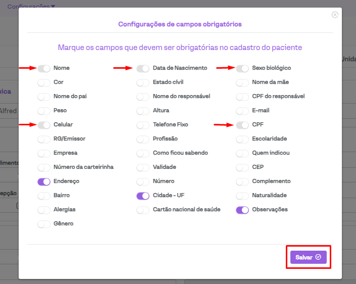Após isto, uma nova janela será exibida, na qual será possível ativar os campos que deseja tornar obrigatório no cadastro do paciente. Os campos em que a chave para ativar aparecem em cinza, são os obrigatórios por padrão. E após configurar conforme desejado, basta clicar no botão "Salvar".