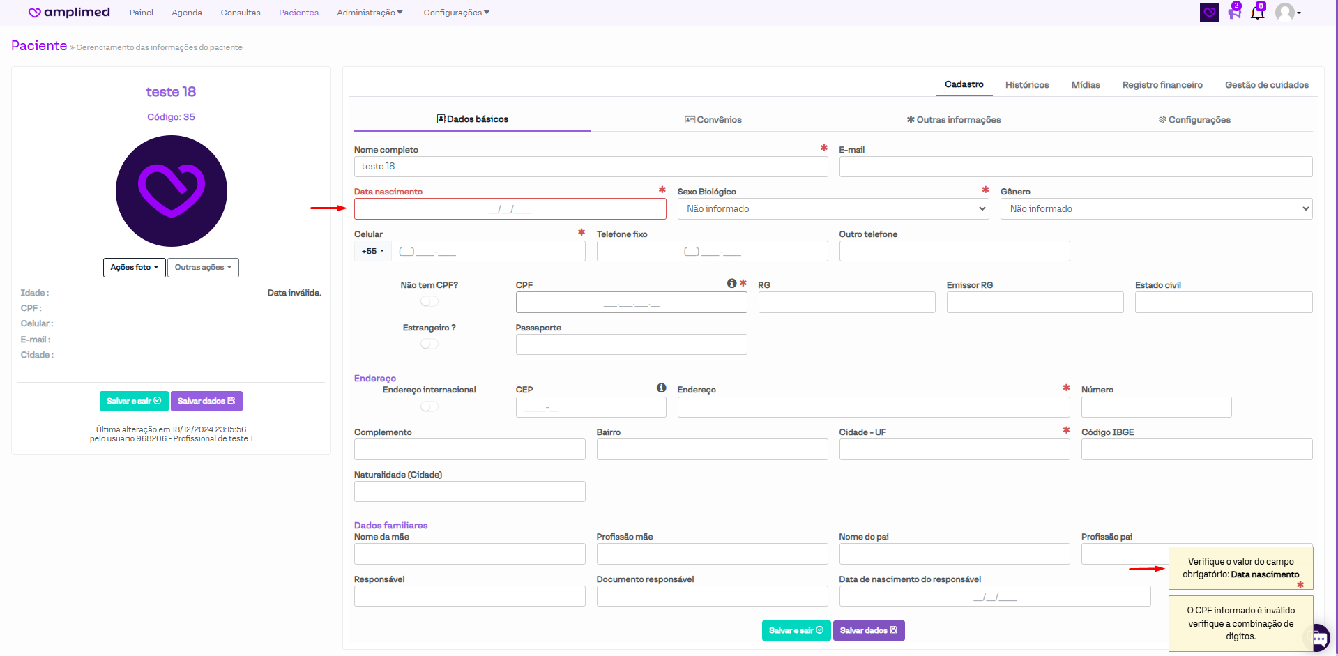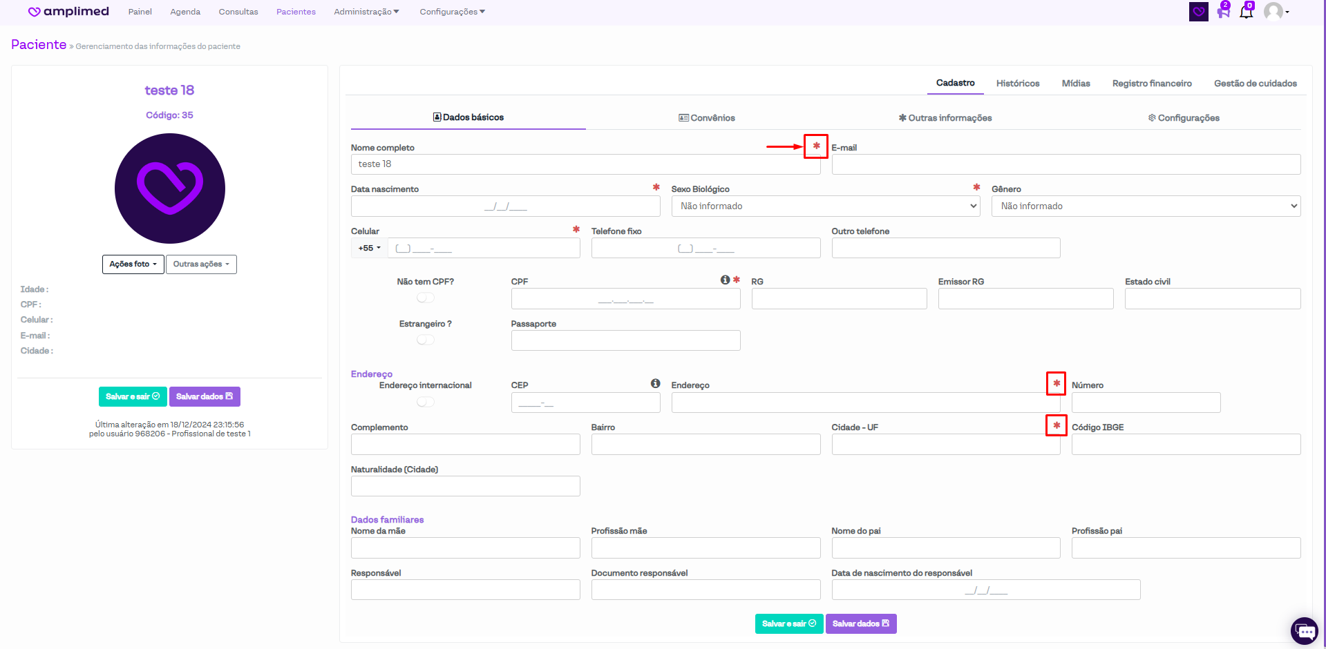 Visualizando os campos obrigatórios dentro do cadastro do paciente
