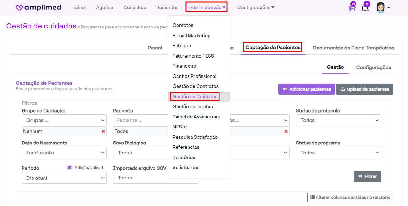 Acesse: Administração > Gestão de Cuidados > Captação de Pacientes