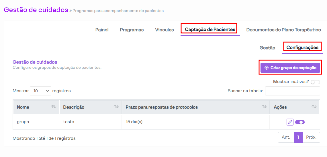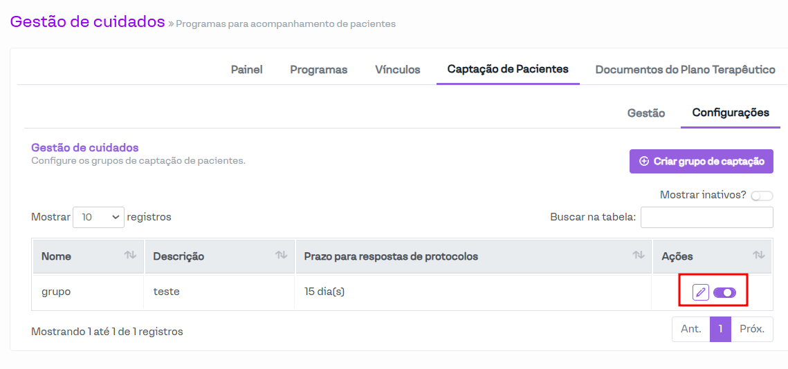 Além disso, nesta página, é possível realizar o gerenciamento dos grupos, como a edição (clicando no ícone de lápis) e desativação (desmarcando a seleção) de grupos de captação de pacientes, conforme imagem abaixo.