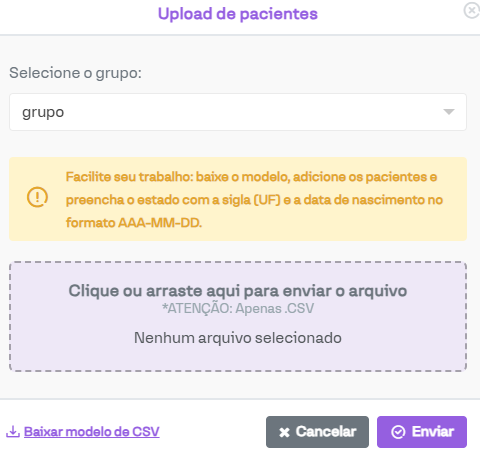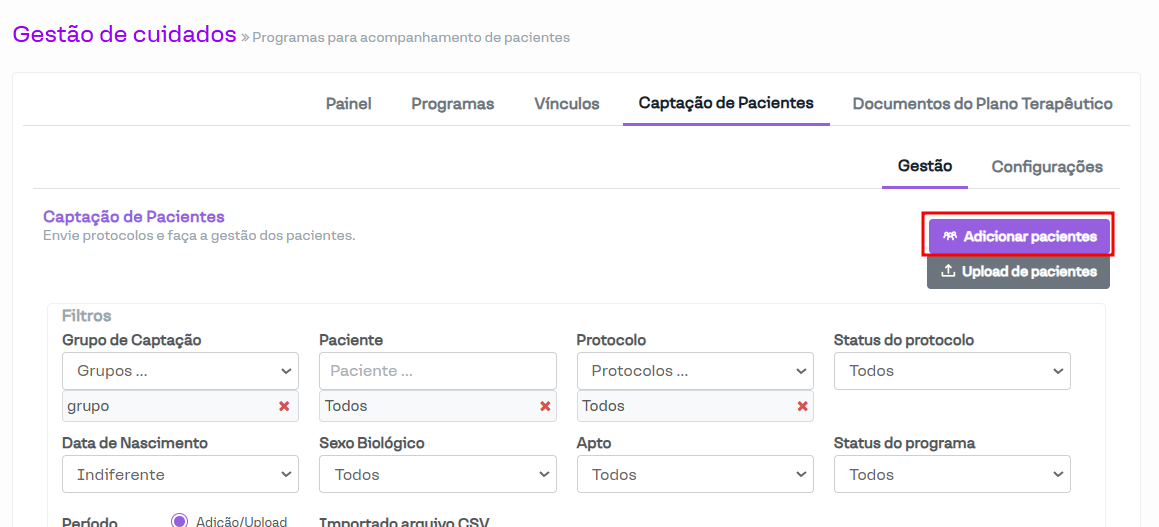 Essa funcionalidade permite importar pacientes para que recebam protocolos e, posteriormente, sejam vinculados aos programas de cuidado.