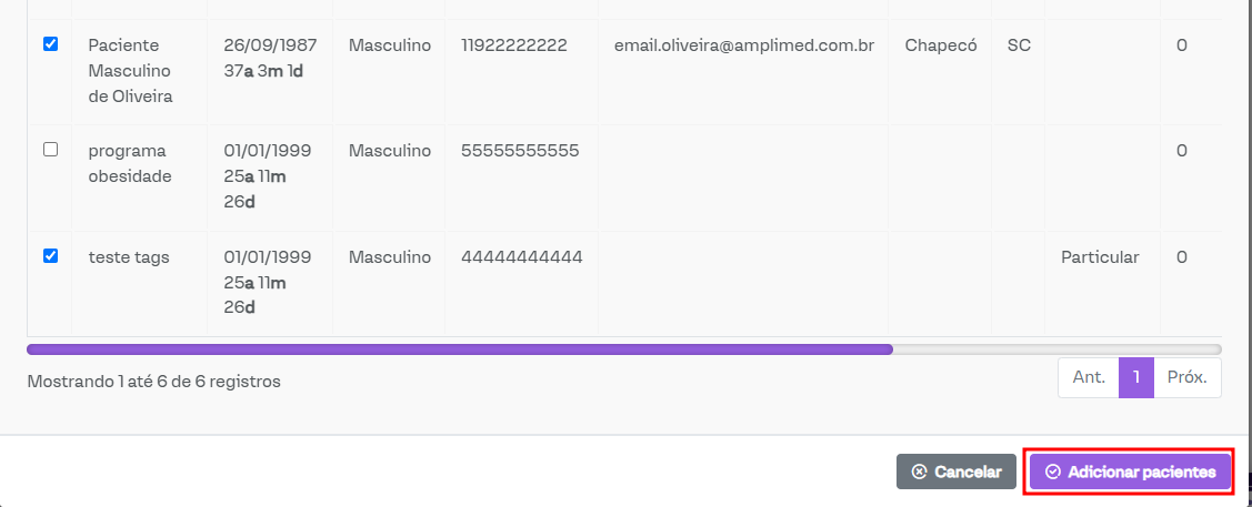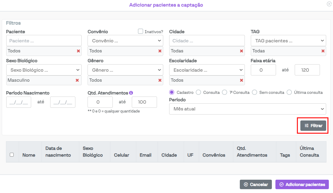 Após selecionar os filtros desejados, basta clicar no botão Filtrar para realizar a busca dos pacientes. Então, selecione os pacientes que deseja importar e clique no botão Adicionar pacientes.