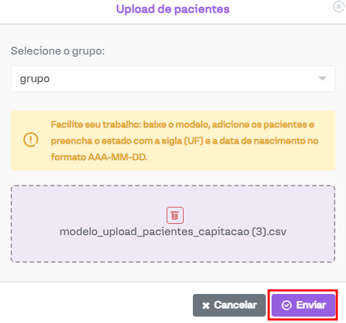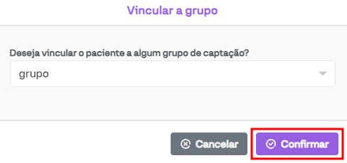 Será solicitado se deseja vincular os pacientes a algum grupo de captação. Basta selecionar a opção desejada e clicar em Confirmar.