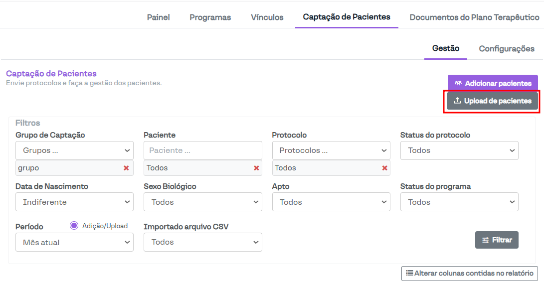 A funcionalidade permite importar dados de pacientes para captação utilizando um arquivo no formato .CSV, com base em um modelo fornecido pelo sistema, que inclui instruções para facilitar o processo de upload. Para realizar essa ação, basta clicar no botão Upload de pacientes.