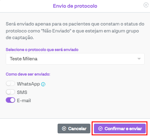Ao clicar no botão Enviar protocolo, será aberta uma janela solicitando o protocolo e como o envio será realizado.
