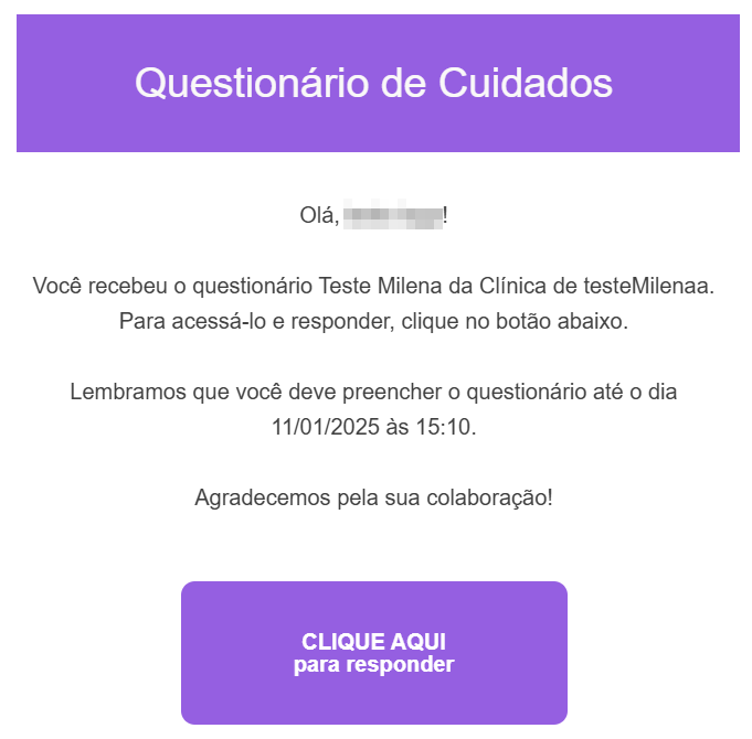 Após realizar o preenchimento, basta clicar no botão Confirmar para enviar. Abaixo, segue o modelo de e-mail recebido pelo paciente.