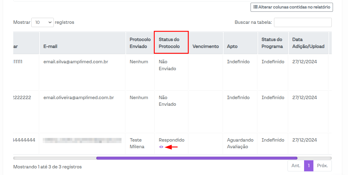 Após o paciente responder ao protocolo, as respostas poderão ser visualizadas no ícone em formato de olho, conforme destacado na imagem a seguir.