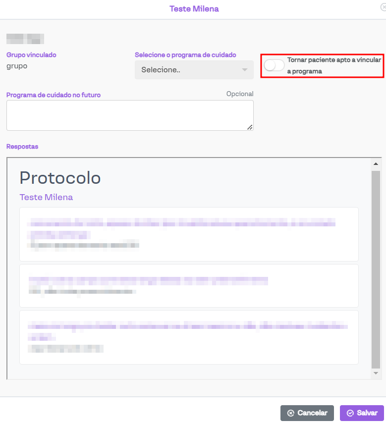 Vínculo a programa de cuidado pelo modal de visualização de respostas