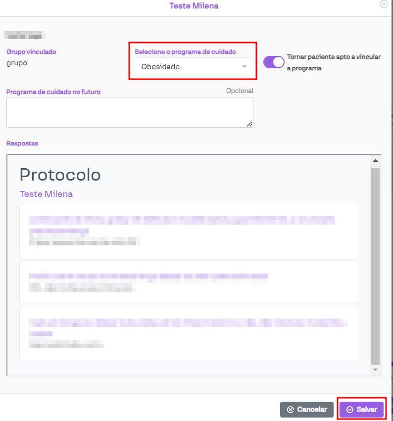 Após isso, basta clicar no botão Salvar, e o paciente será vinculado automaticamente ao programa de cuidado selecionado.