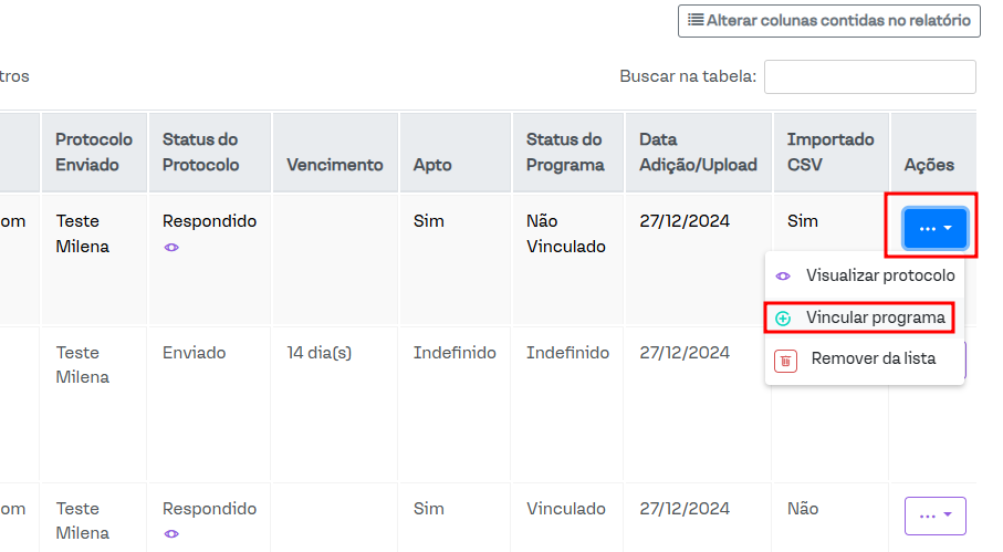 Vale destacar que a opção Vincular programa somente aparecerá após selecionar que o paciente está apto, através da opção Visualizar protocolo.