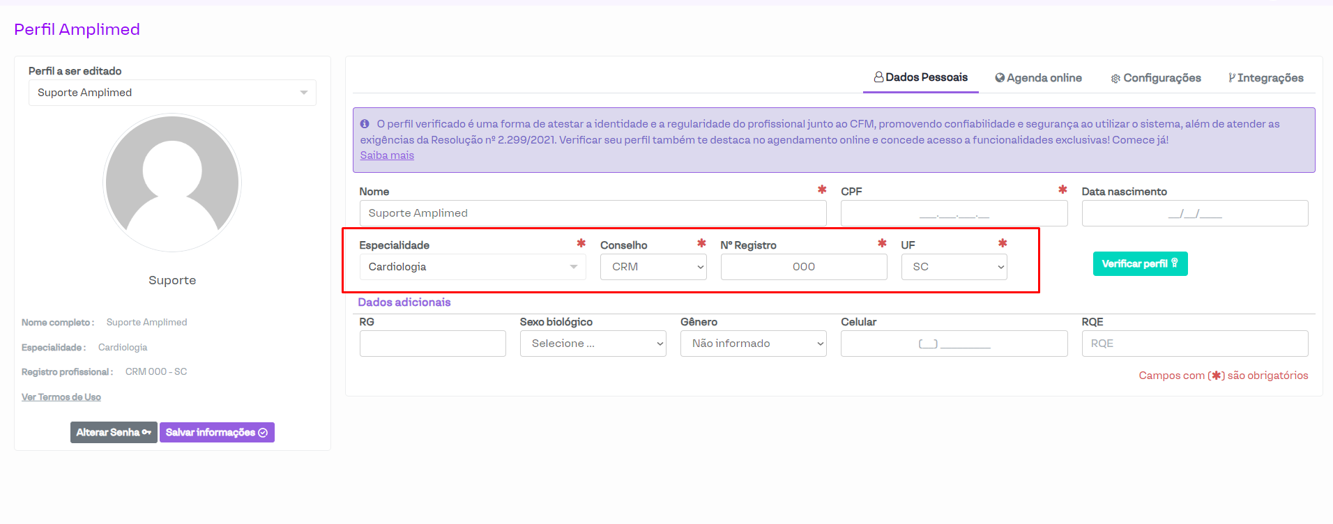 Para configurar seu certificado dentro do sistema é preciso que tenha todas as informações do seus dados pessoais cadastradas corretamente, sendo 3 delas as principais: Especialidade, N° Registro e UF. Essas informações serão inseridas no campo do certificado.