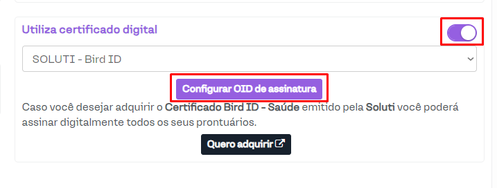 Com essas informações preenchidas, o profissional deve acessar as configurações, no campo Utiliza certificado digital e ativar o botão que faz com que seja possível utilizar o certificado dentro do sistema.