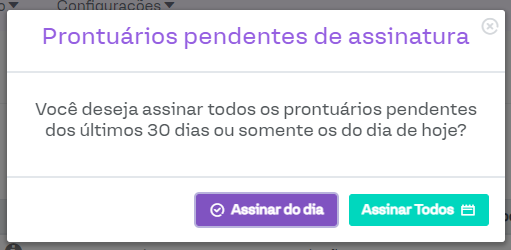 É possível estar realizando duas funções de assinaturas, a "Assinar do dia" que é utilizada para assinar todos os prontuários que foram gerados no dia, seja pelos agendamentos ou adicionando evoluções diretamente pelo cadastro do paciente e a "Assinar todos", que realiza a assinatura de todos os prontuários gerados nos últimos 30 dias.