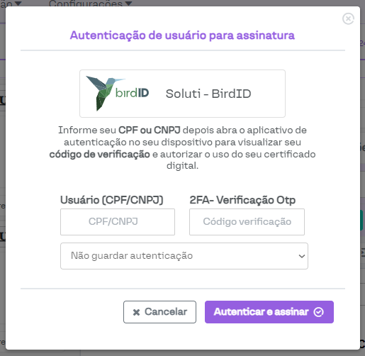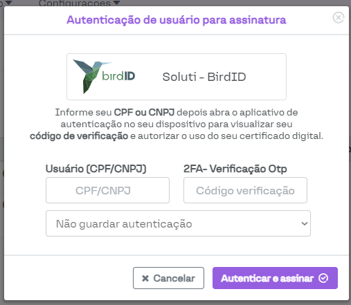 Após selecionar uma das opções o usuário será direcionado para a janela de autenticação da certificação que possui para finalizar a assinatura.