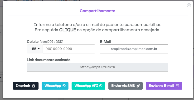Clicando nesse botão o profissional precisará selecionar se deseja compartilhar apenas ou assinar além de escolher o modelo de impressão/compartilhamento que deseja utilizar.