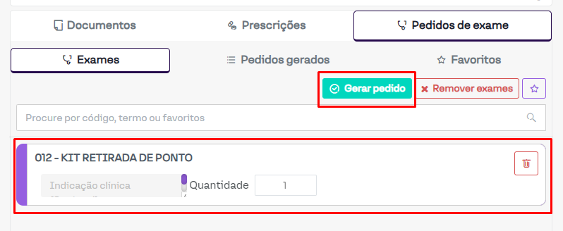 Para os exames, o profissional deve estar gerando o pedido através do campo "Pedidos de exame", na sequencia selecionando o exame desejado na barra de busca e clicando em "Gerar pedido".