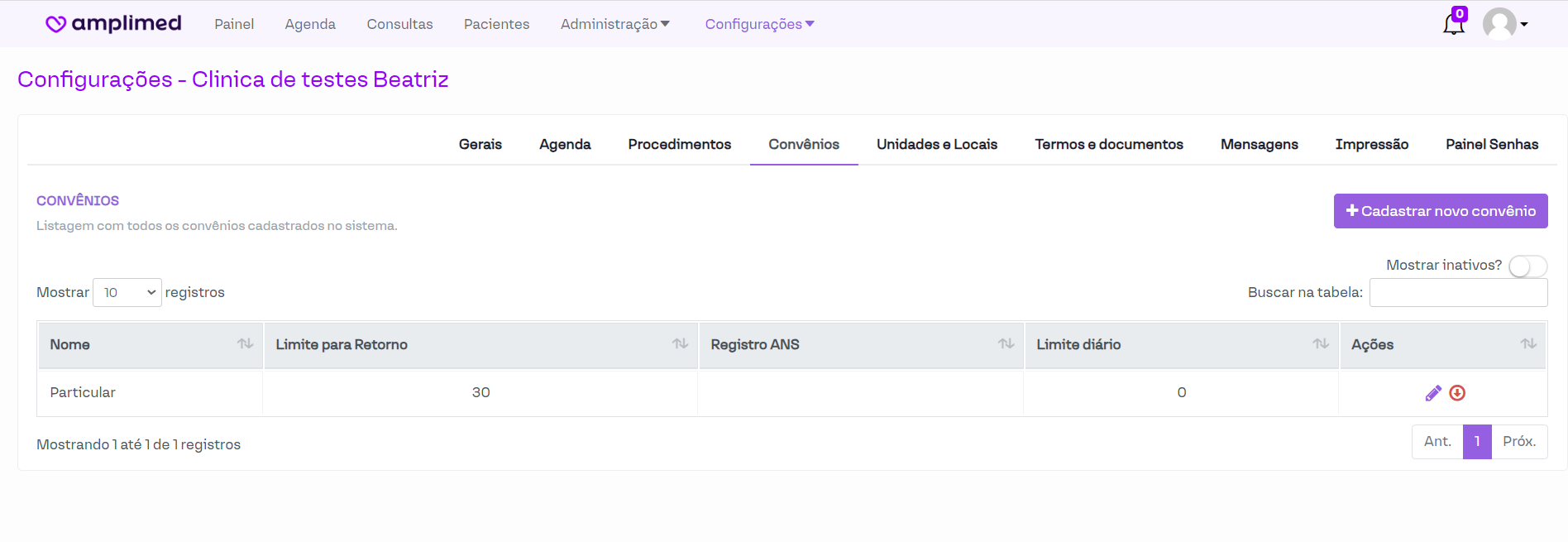 Digite o nome do convênio e clique em "Salvar". Sua tela sofrerá uma alteração e ficará assim: