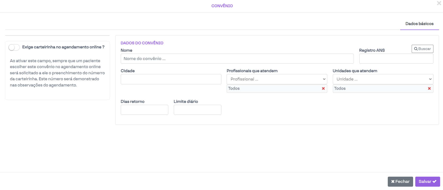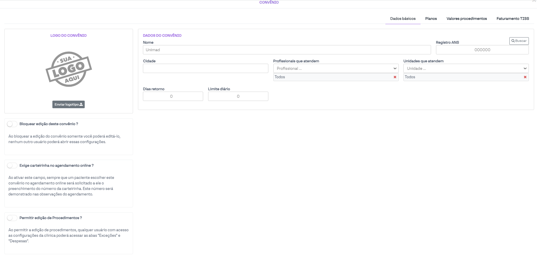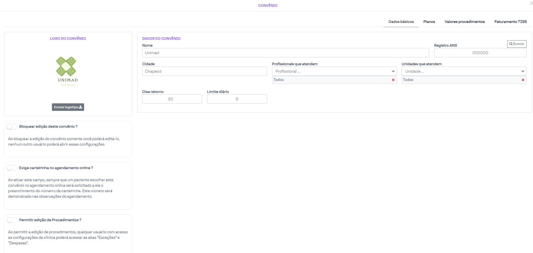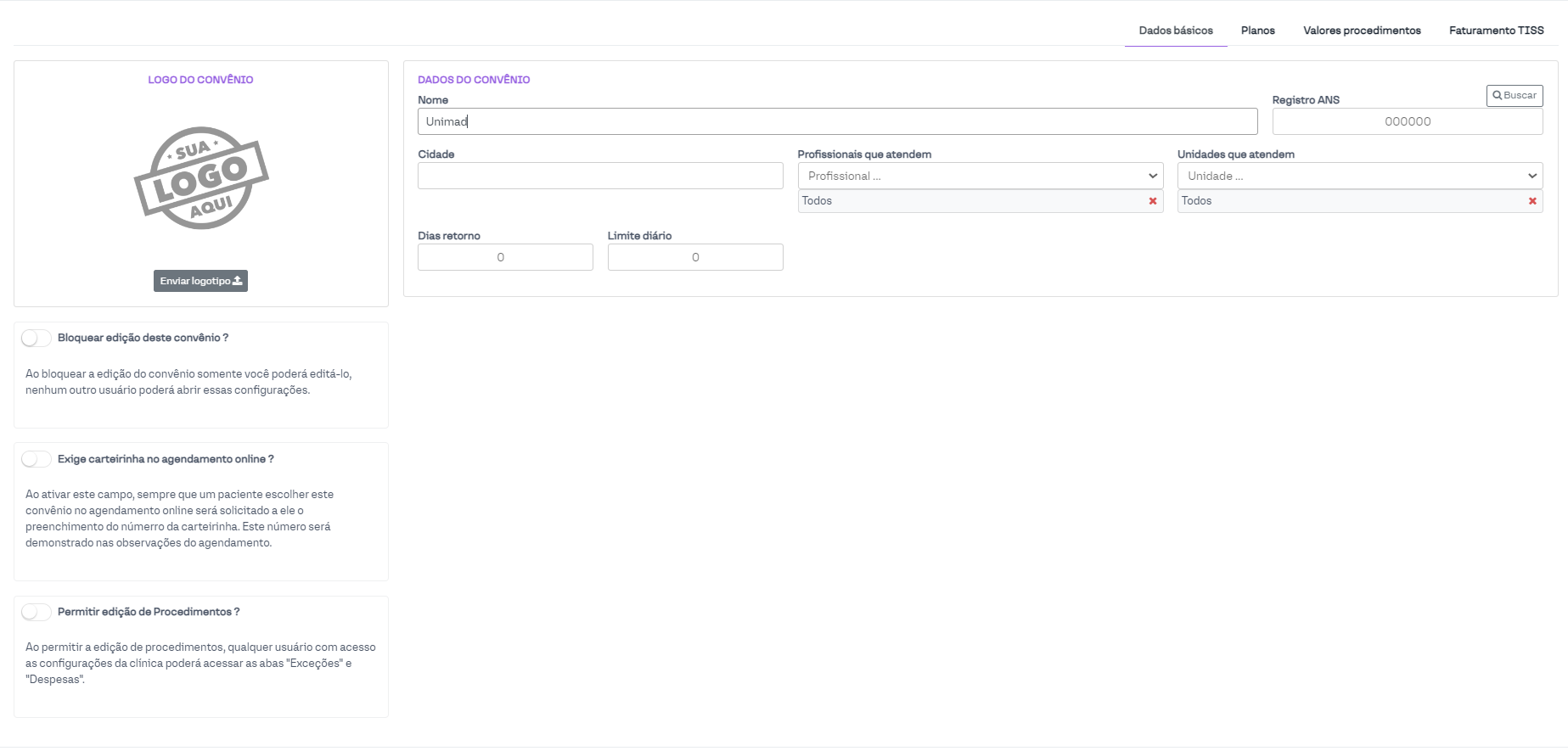 Vamos primeiro alterar os campos dos dados básicos. O nome já está definido. Agora, você pode adicionar o Registro da ANS, Cidade do convênio, unidades de atendimento da sua clínica, médicos que atendem, quantidade de dias máximo para retorno e limite diário de consultas que sua clínica vai atender com esse convênio. Você também tem a opção de bloquear a edição do convênio, para que ninguém além de você possa editá-lo.