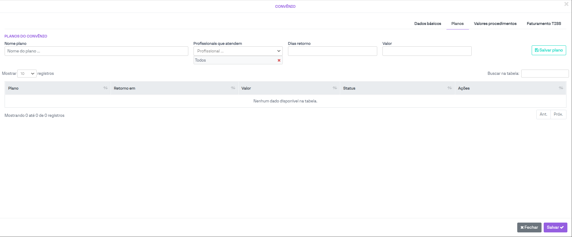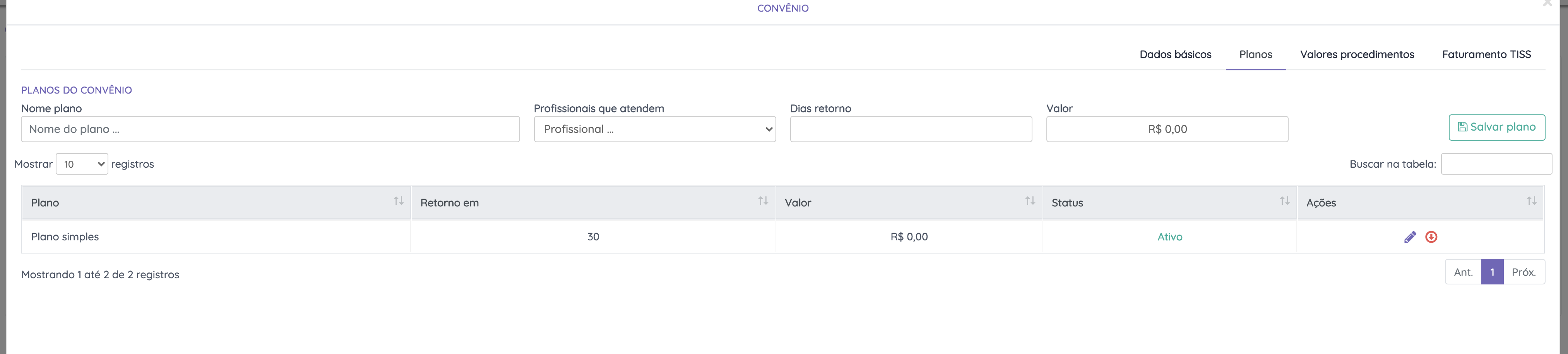 O campo "Valor" em "Planos" serve para que toda vez que você selecionar o plano desse convênio para uma consulta ou procedimento, ele custe o valor que você definiu ali.