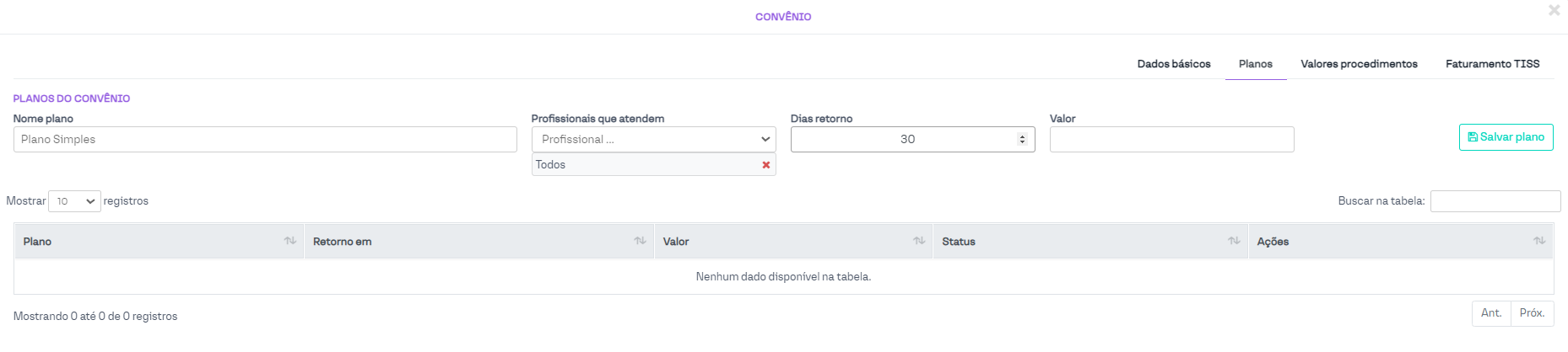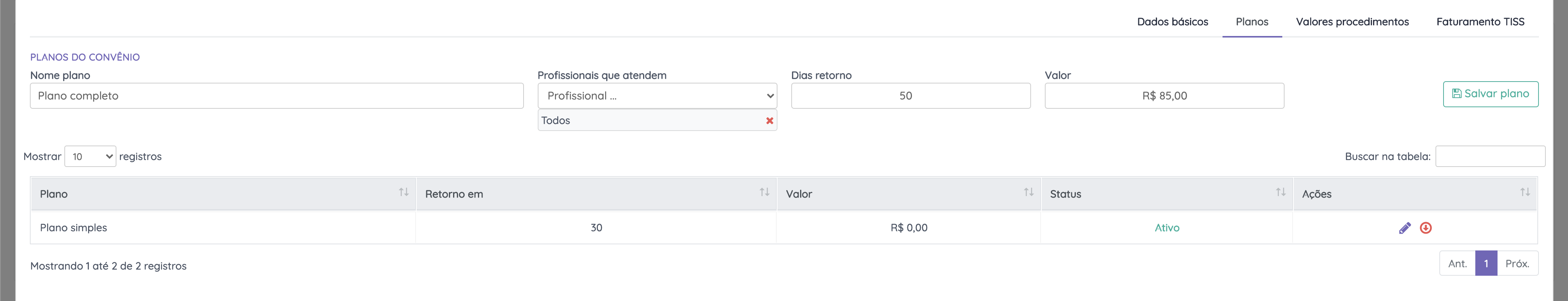 Primeiro, comece a escrever o nome do plano, os profissionais que o atendem, dias de retorno e valor. Vai ficar assim, e você pode clicar em "Salvar plano".