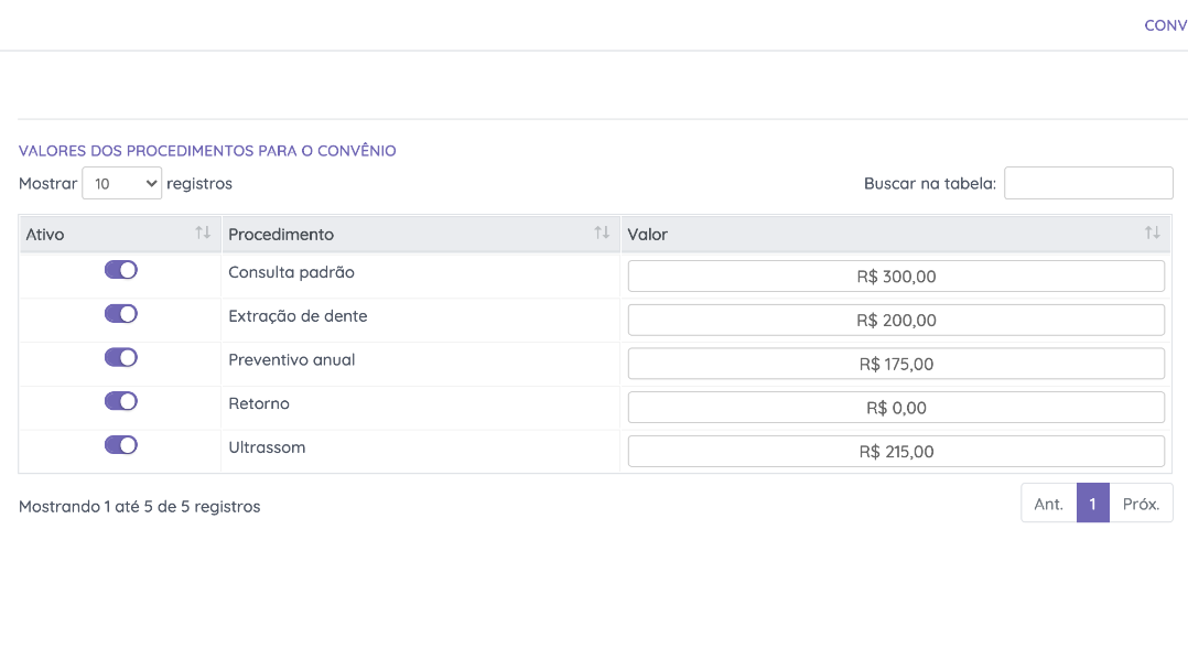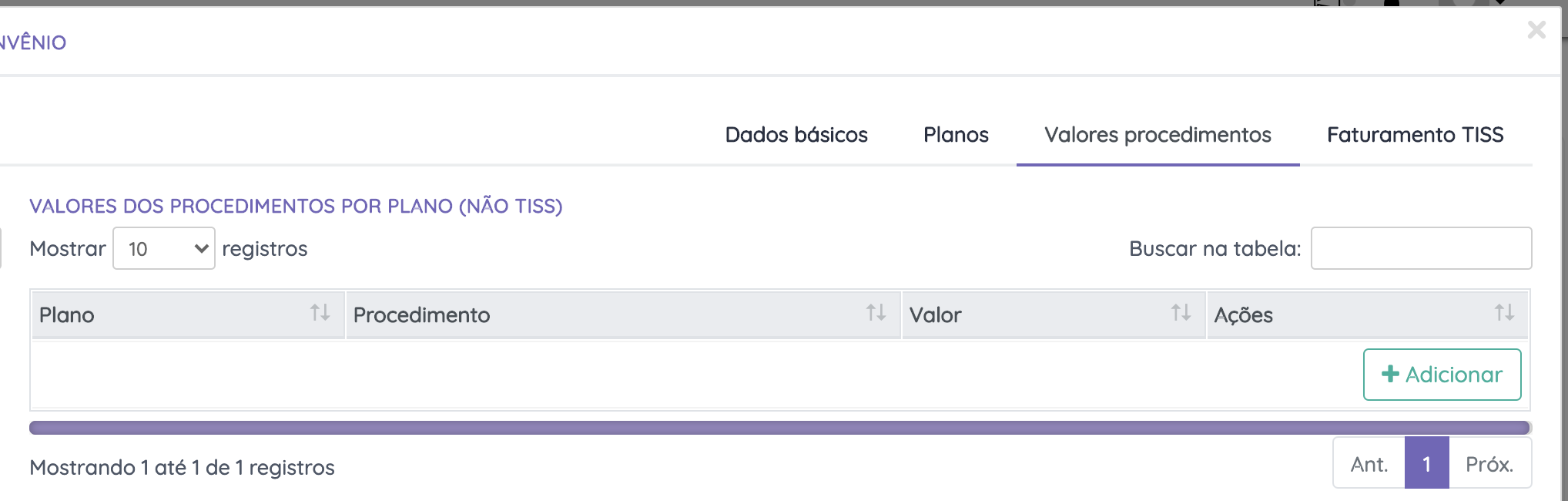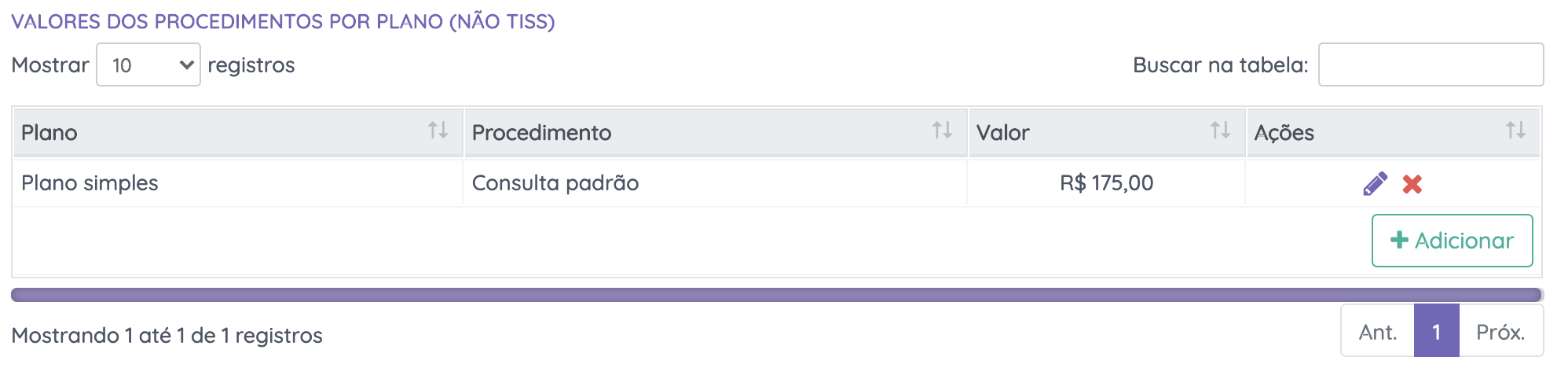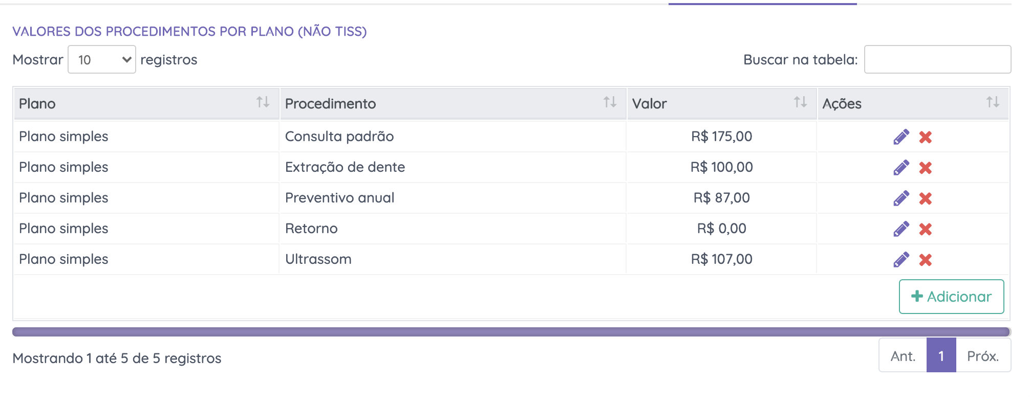 Ele ficará salvo como valor do procedimento dentro do plano selecionado e você poderá alterar mais tarde se quiser, clicando no lápis roxo que aparece ao lado do "X" vermelho: