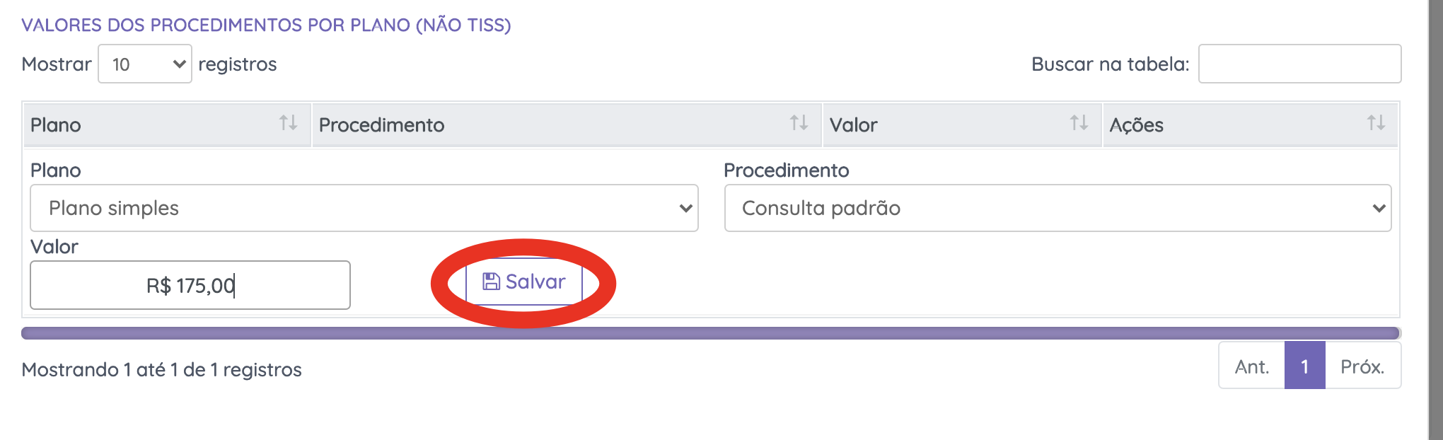 Então, adicione o Plano selecionado, o valor e o procedimento. Após isso, clique em "Salvar". Assim: