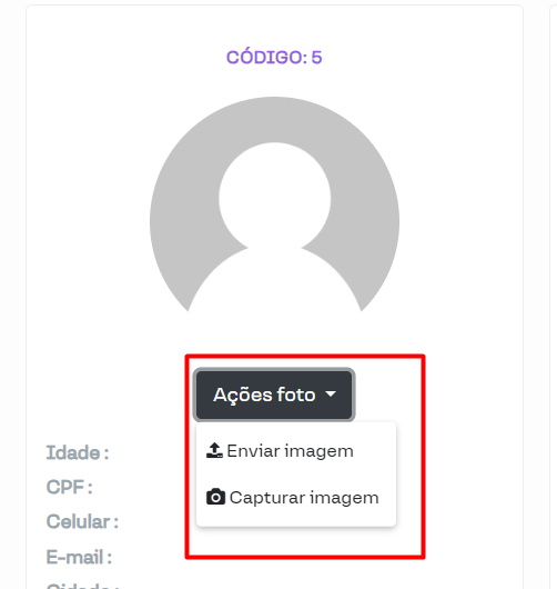 Ao cadastrar um novo paciente ou editar um paciente já cadastrado, é possível incluir uma foto do mesmo através do botão "Ações foto"