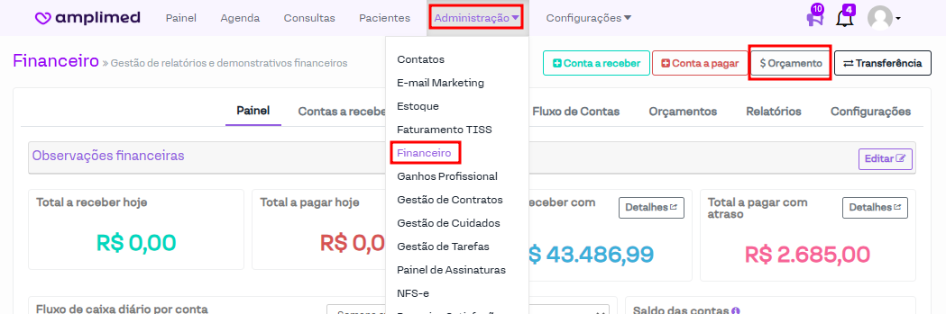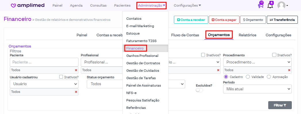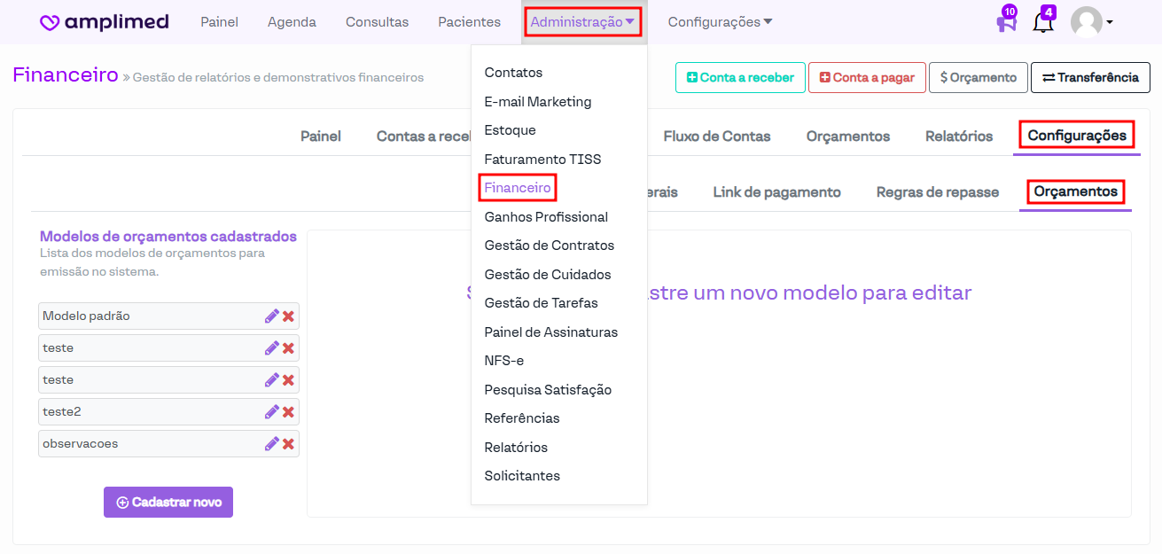 Para verificar a lista de orçamentos já criados, basta acessar Administração > Financeiro na aba Orçamentos.