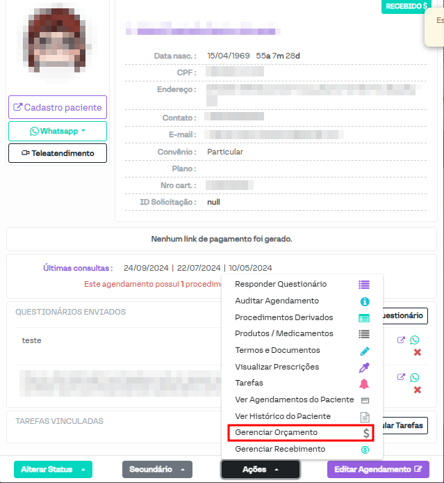 Acesse: Agenda > Agendamento > Ações > Gerenciar Orçamento