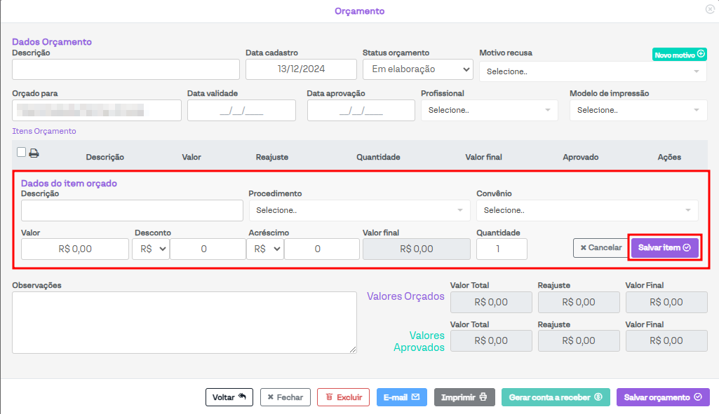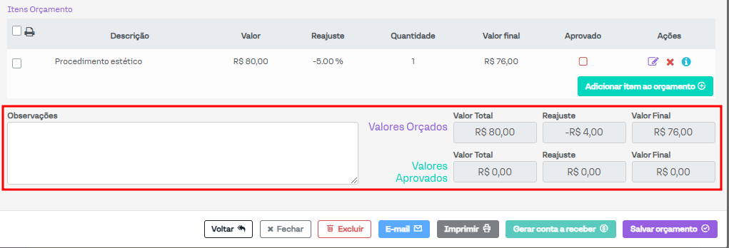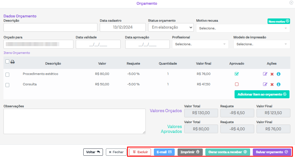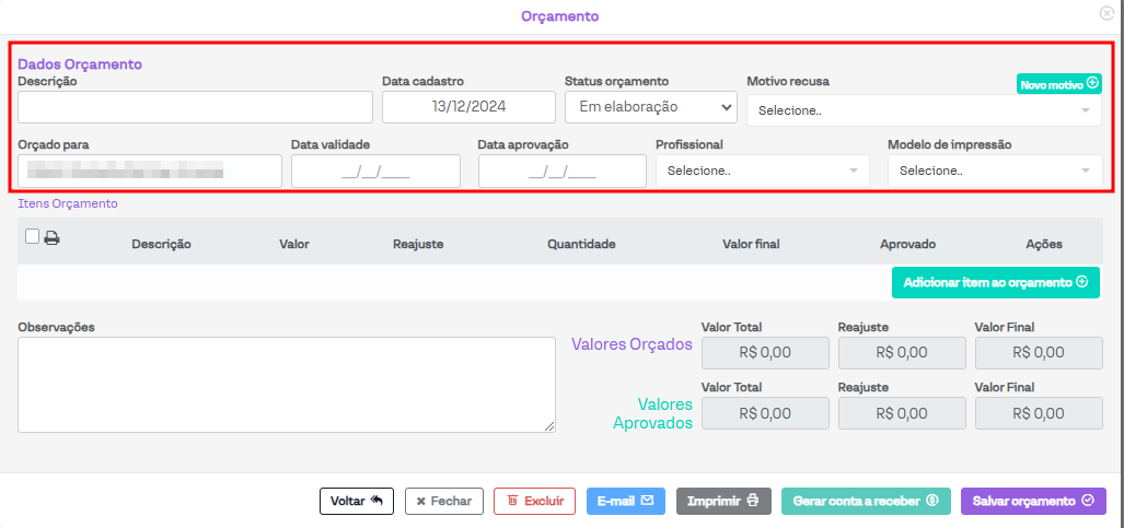 Observações: Permite incluir notas referentes ao orçamento criado.