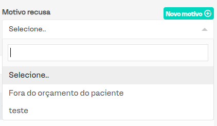 Motivo da Recusa: Caso o orçamento seja recusado, é possível incluir o motivo da recusa. O motivo precisa estar previamente cadastrado; caso nenhum motivo existente atenda à necessidade, é possível cadastrar um novo clicando no botão "Novo motivo".