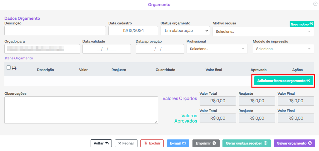 Profissional: Permite incluir o profissional vinculado ao orçamento.