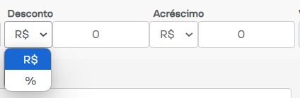 Desconto: Permite incluir descontos no valor do item. O desconto pode ser em reais ou em porcentagem, conforme demonstrado na figura a seguir.