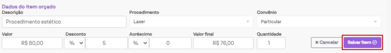 Procedimento, Convênio: Permite incluir o procedimento e o convênio relacionados ao item do orçamento.