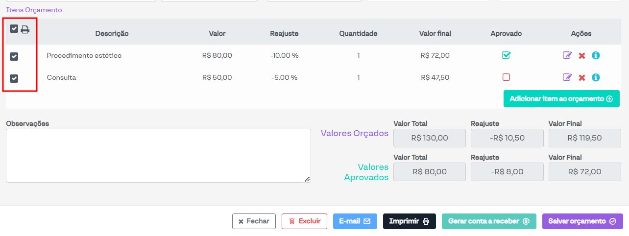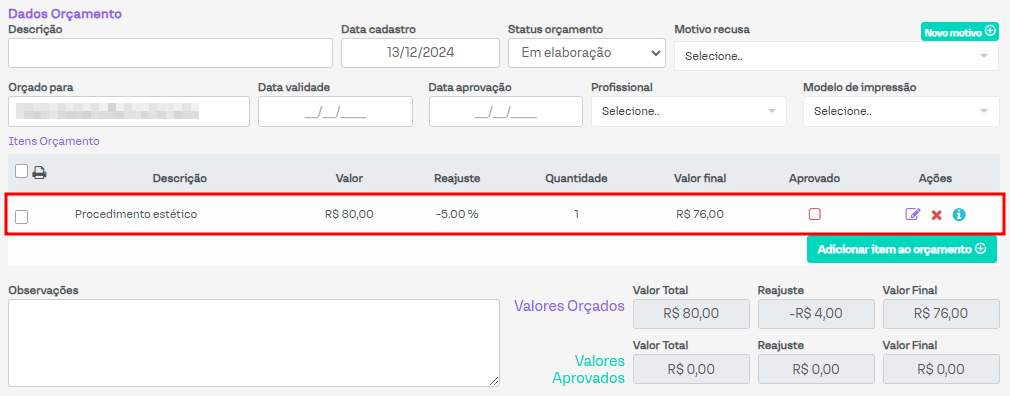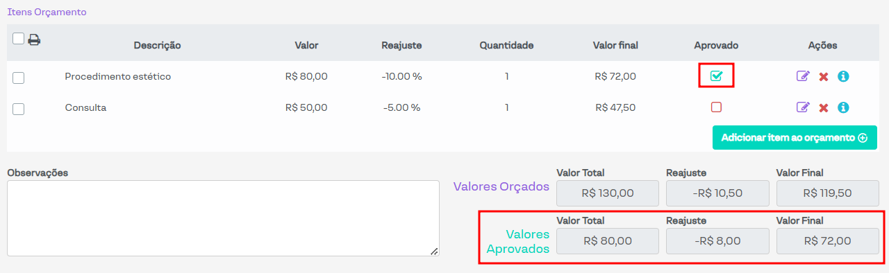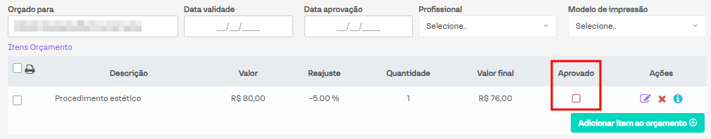 Para aprovar um item do orçamento, basta marcar a opção Aprovado.