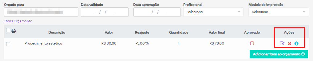 Editar item (ícone de lápis): Permite editar o item incluído no orçamento, habilitando os mesmos campos que são usados ao adicionar um item ao orçamento.