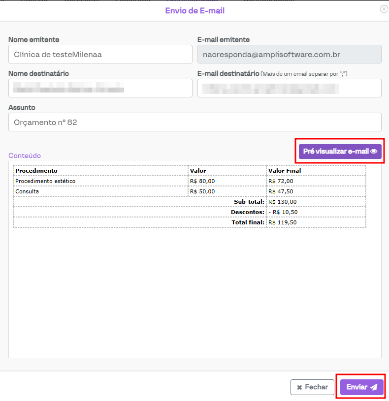 É possível visualizar o e-mail antes de enviá-lo clicando no botão Pré-visualizar e-mail. Para enviá-lo, basta clicar no botão Enviar.
