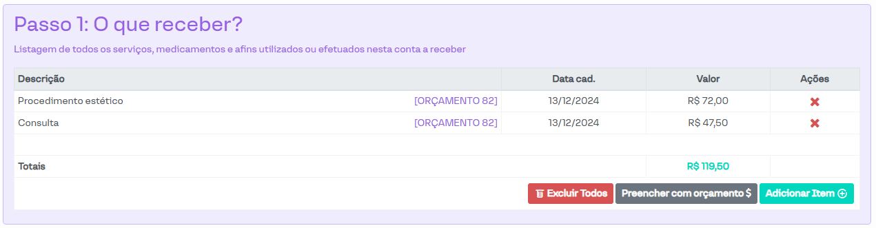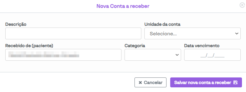 Gerar Conta a Receber: Permite gerar uma nova conta a receber com os itens do orçamento. Será aberta uma janela para criar uma nova conta a receber, com o paciente já preenchido com os dados do orçamento.