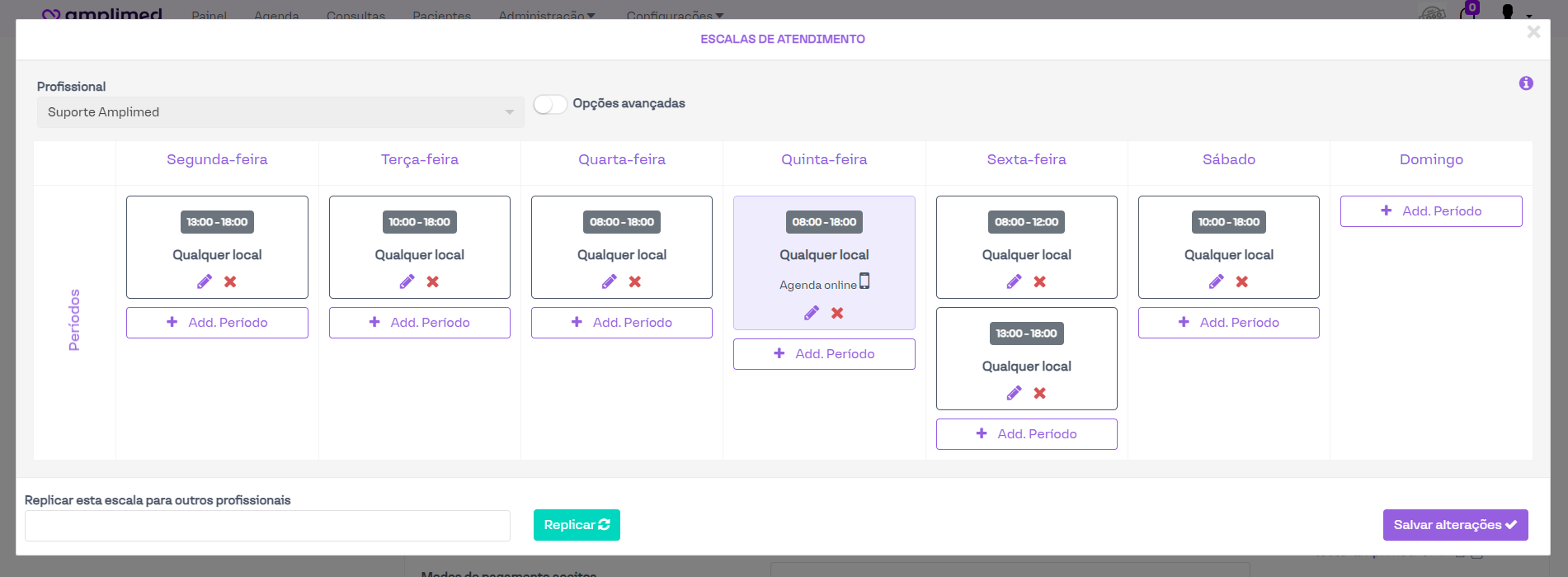 Ao escolher um dos slots da agenda, clique em Editar e ative a opção "Período disponível online para Agendamento Aplicativo Amplimed?".