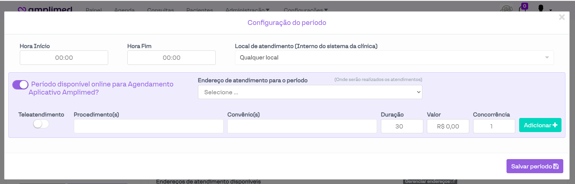 Atenção: É necessário definir um endereço de atendimento para o período.