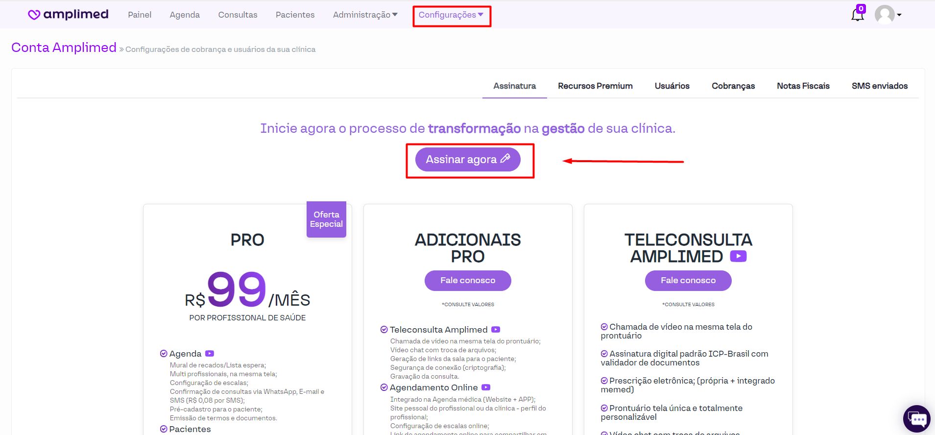 Para localizar suas informações de pagamento, deve seguir para "configurações" > "configurações de conta" > "configurar Clinica" > "assinatura"