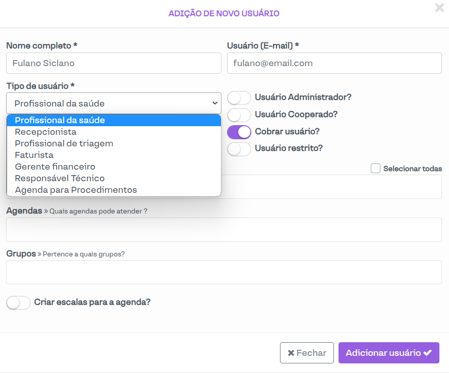 Após clicar em "+ Adicionar usuário" você precisará preencher os dados do novo profissional, como nome completo e e-mail