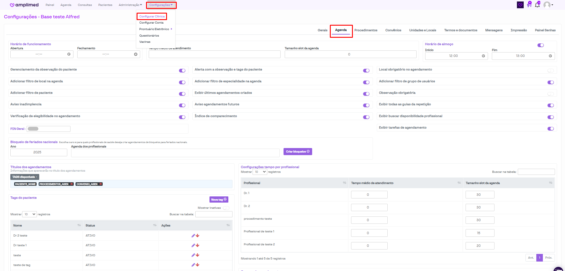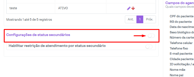 Para ativar a utilização do status secundário em sua clínica, estando na aba de configurações da "Agenda", encontre e ative a opção "Configurações de status secundários". Este campo fica localizado à direita da tela, será preciso descer um pouco a sua página.