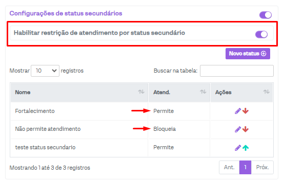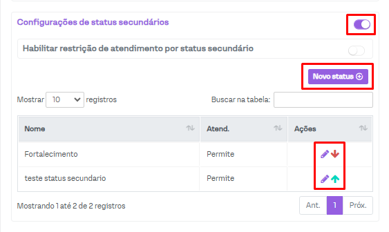 Para reativar um status que havia sido desativado, clique no ícone de seta apontando para cima, em verde.