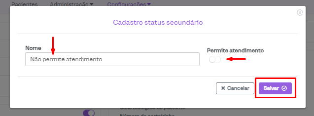 Os status secundários são utilizados para criação de status personalizados que sejam adequados a sua clínica. O seu uso permite criar status que servem para auxiliar no fluxo de atendimento, podendo restringir momentaneamente ou permitir o início da consulta.