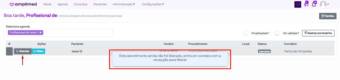 Somente após ser inserido um status secundário ativo e que permite o atendimento, no agendamento, que o(a) profissional poderá prosseguir com a consulta. Caso isso não seja feita e esta opção de restrição esteja ativa, quando o(a) profissional clicar em atender, será exibida uma mensagem solicitando para contatar a recepção para liberar o atendimento.
