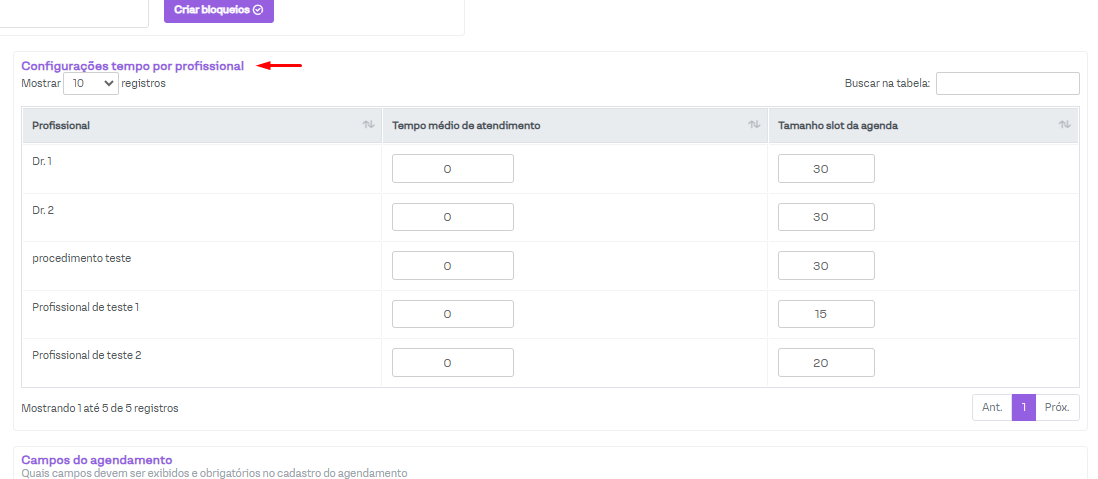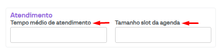 Configurações do tempo médio de atendimento e do tamanho da agenda por profissional