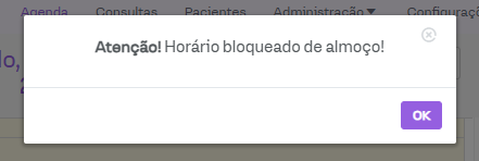 Além disso, quando esta função estiver ativada, caso seja tentado cadastrar um agendamento durante o horário definido, será exibida uma mensagem avisando que não é possível realizar o agendamento.